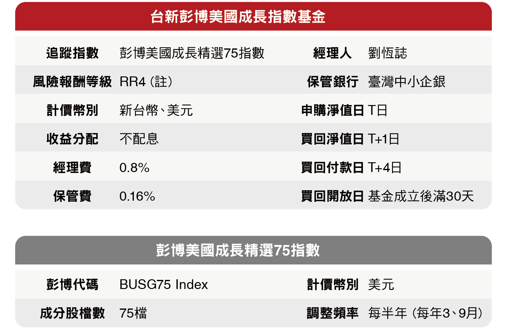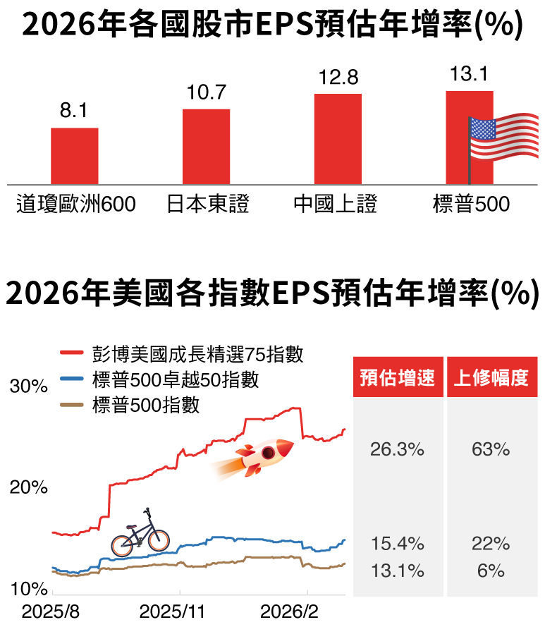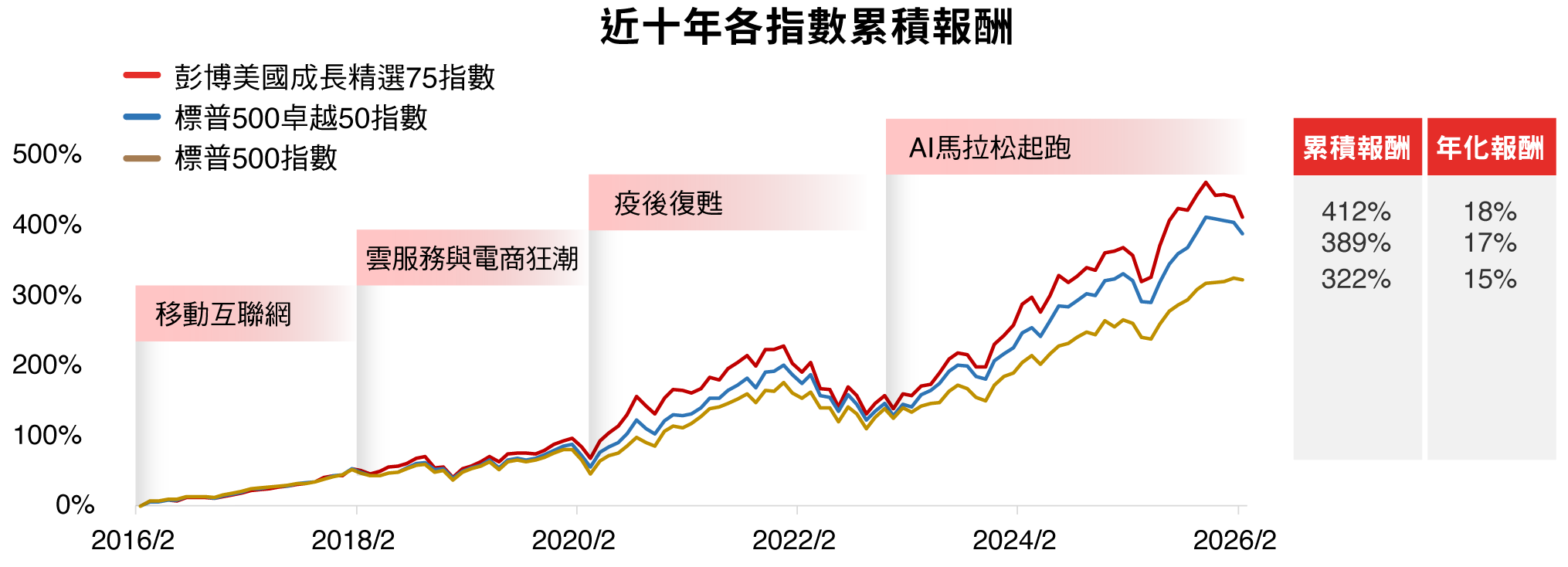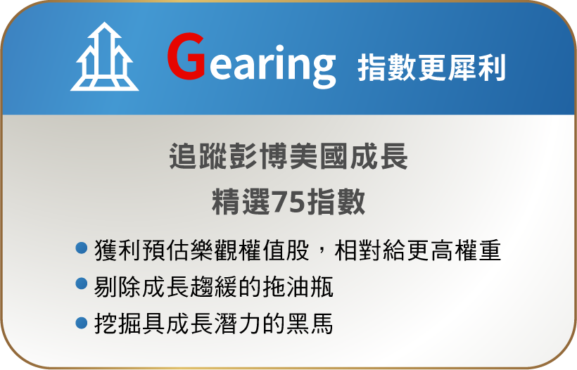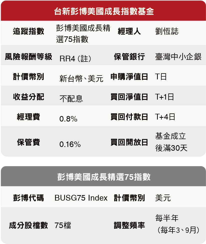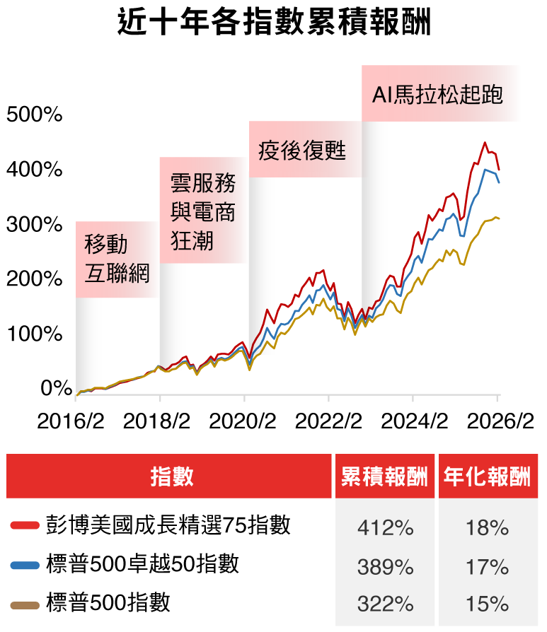 資料來源:Bloomberg、台新投信整理。資料日期:2026/2/28。彭博美國成長精選75指數採US growth select 75 index,本指數總報酬公式為「(計算終值-計算起始價)/計算起始價*100%」。因追蹤指數採每半年調整,成分股與權重均有可能變動,所指涉表現係反映該日期當下指數特性非指涉過去與未來表現。