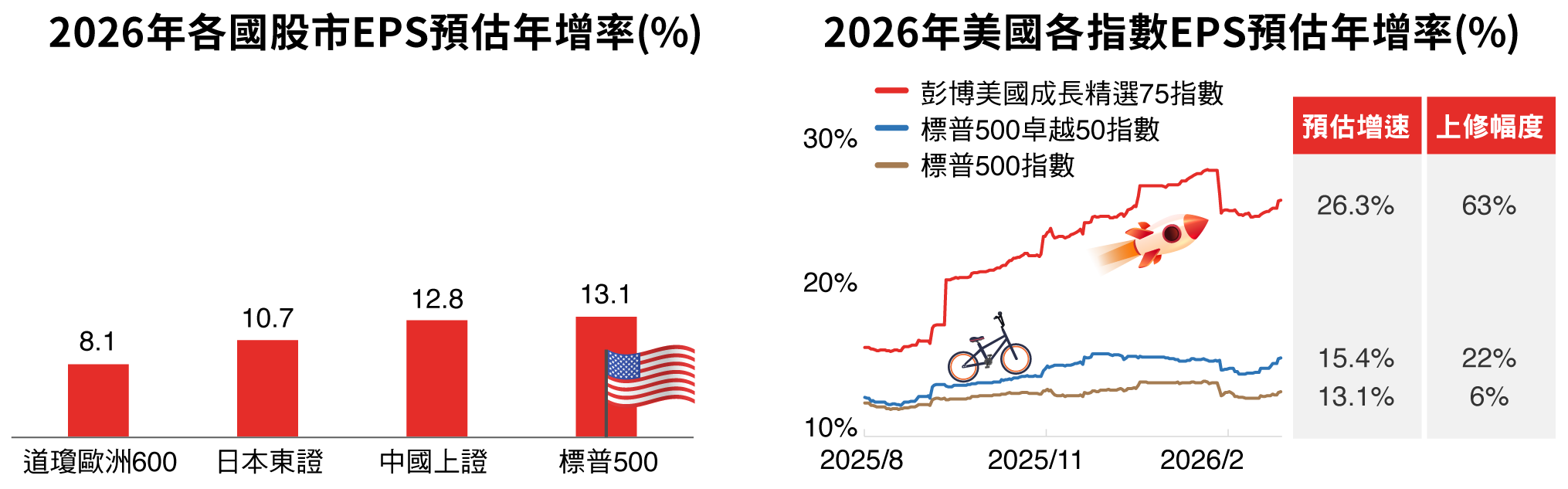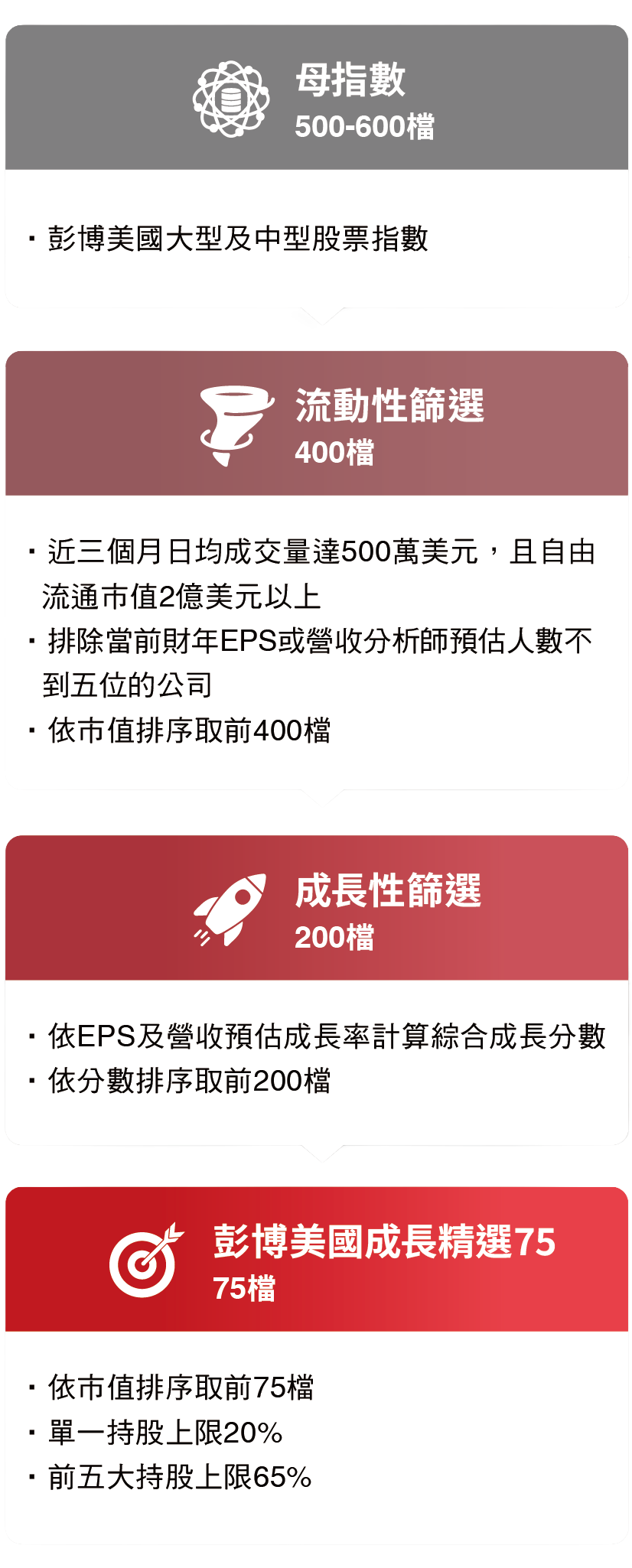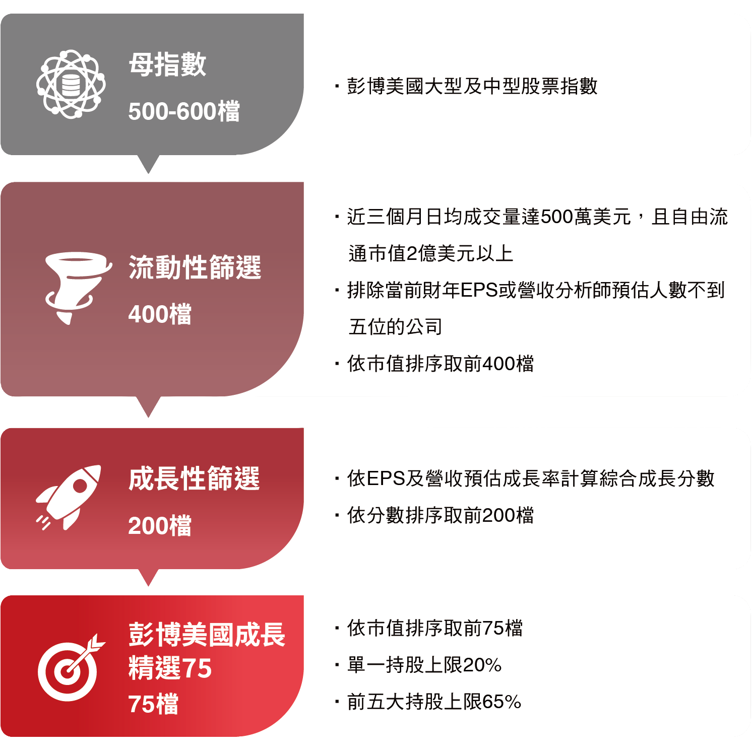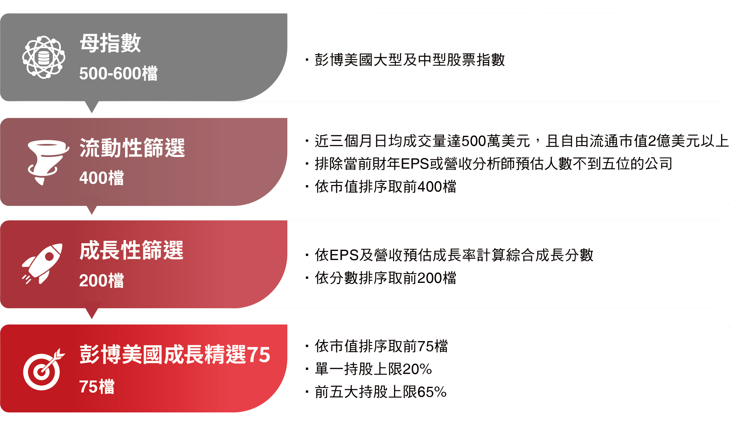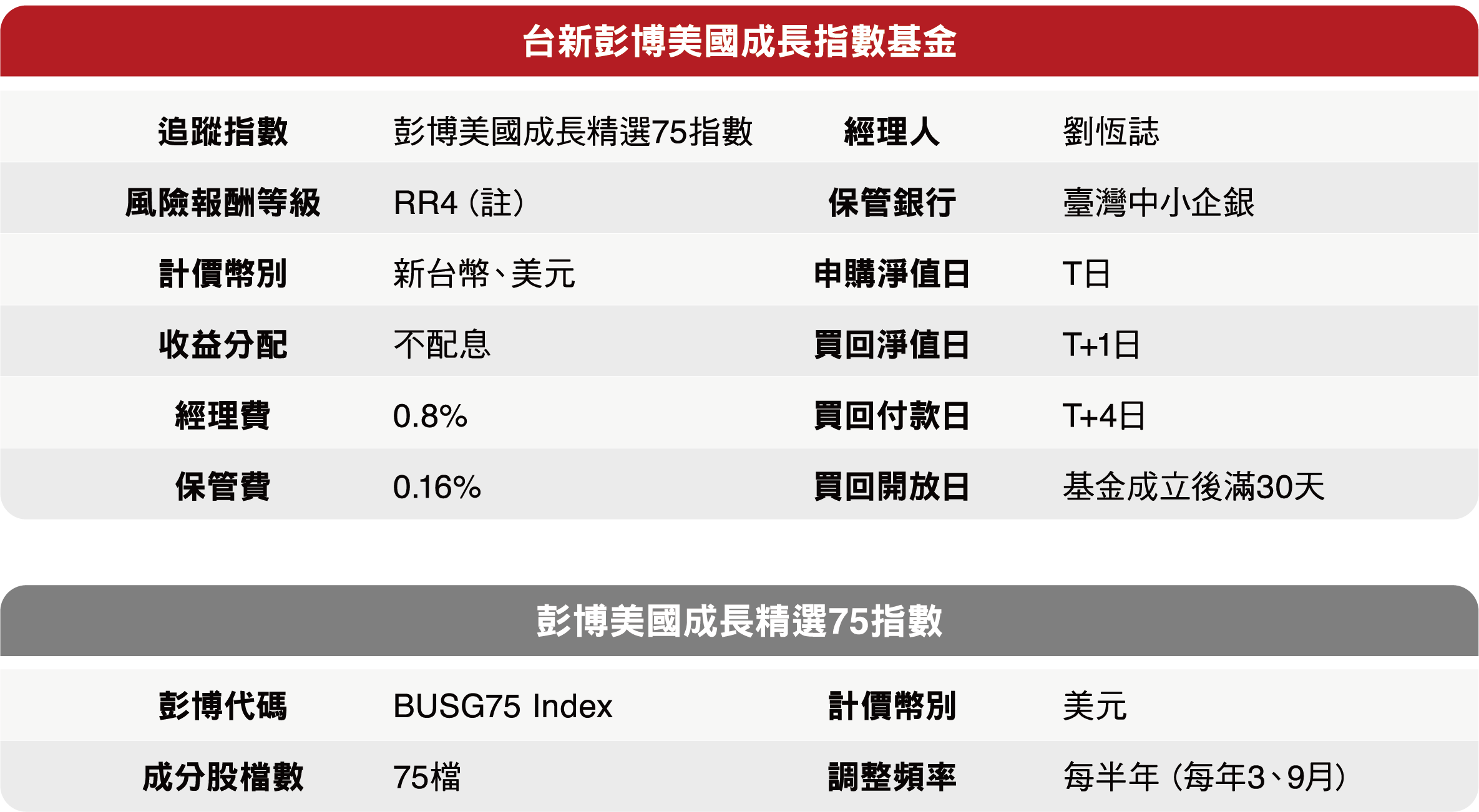 資料來源:Bloomberg、台新投信整理。資料日期:2026/2/28。彭博美國成長精選75指數採US growth select 75 index,本指數總報酬公式為「(計算終值-計算起始價)/計算起始價*100%」。因追蹤指數採每半年調整,成分股與權重均有可能變動,所指涉表現係反映該日期當下指數特性非指涉過去與未來表現。