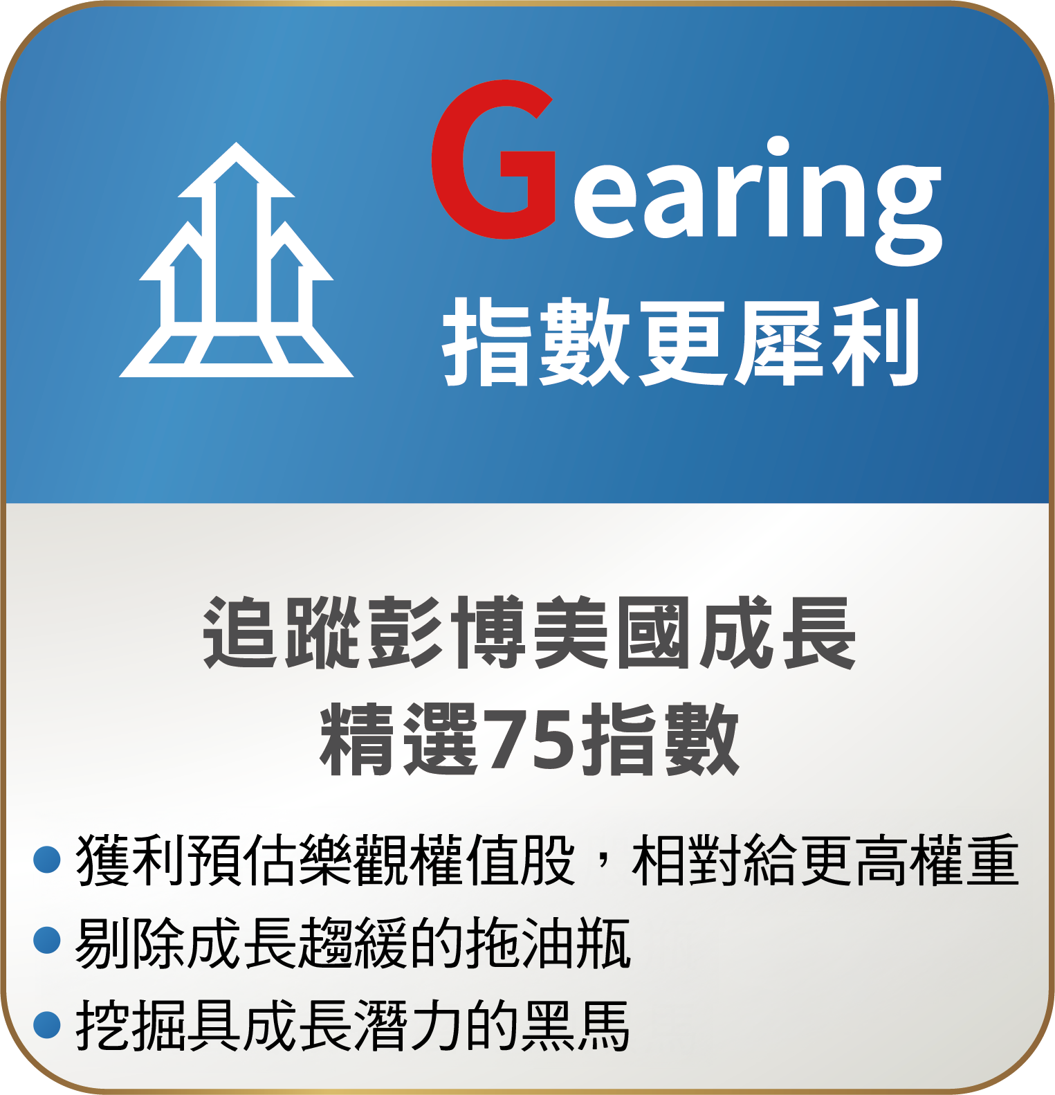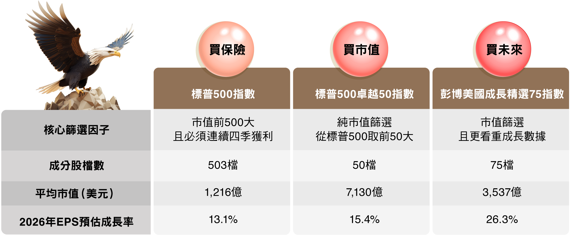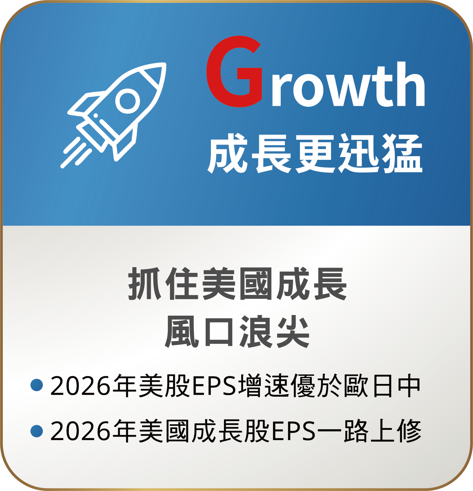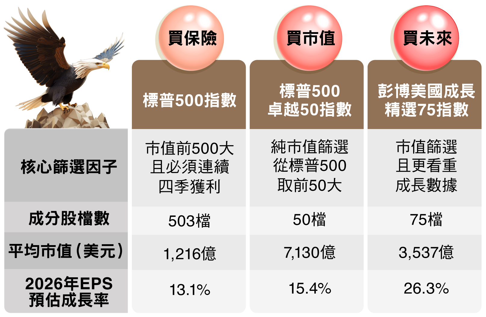 資料來源:Bloomberg、台新投信整理。資料日期:2026/2/28。彭博美國成長精選75指數採US growth select 75 index,本指數總報酬公式為「(計算終值-計算起始價)/計算起始價*100%」。因追蹤指數採每半年調整,成分股與權重均有可能變動,所指涉表現係反映該日期當下指數特性非指涉過去與未來表現。