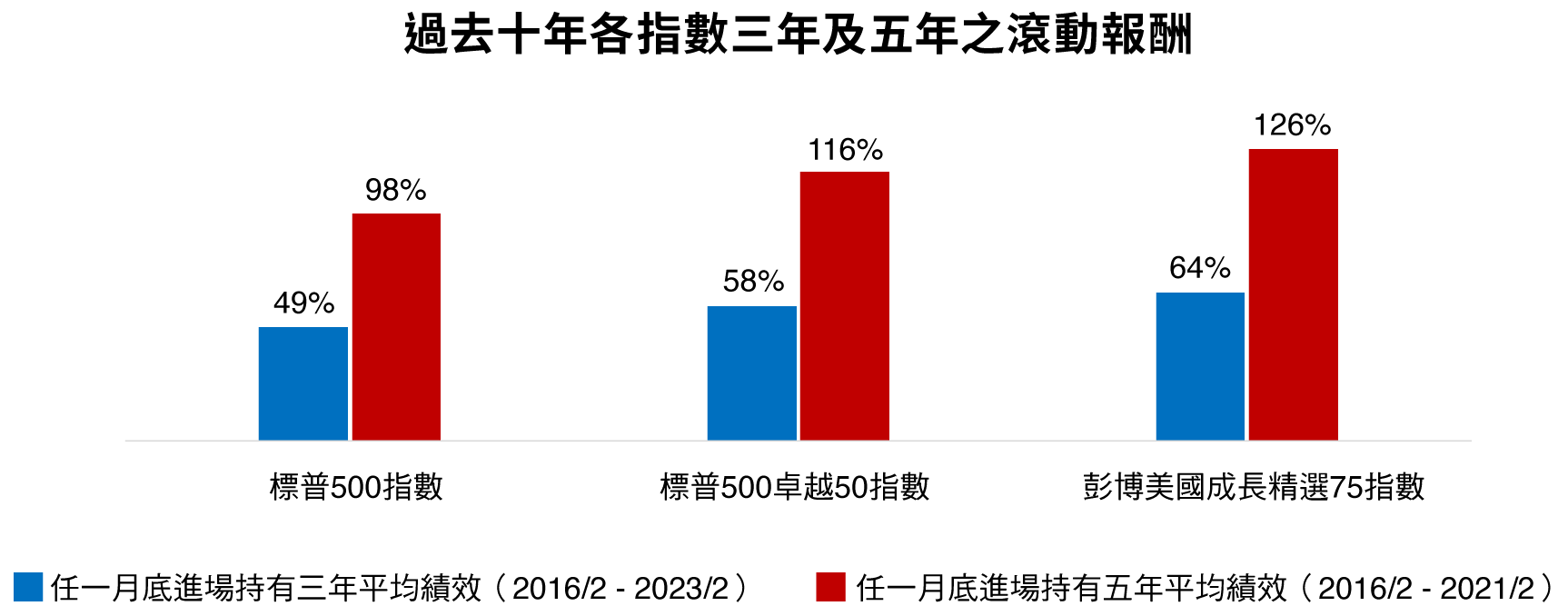 過去十年,任一個月進場持有美國成長股三年及五年,滾動報酬平均分別達64%、126%,長期表現優於美股大盤或市值型股票。